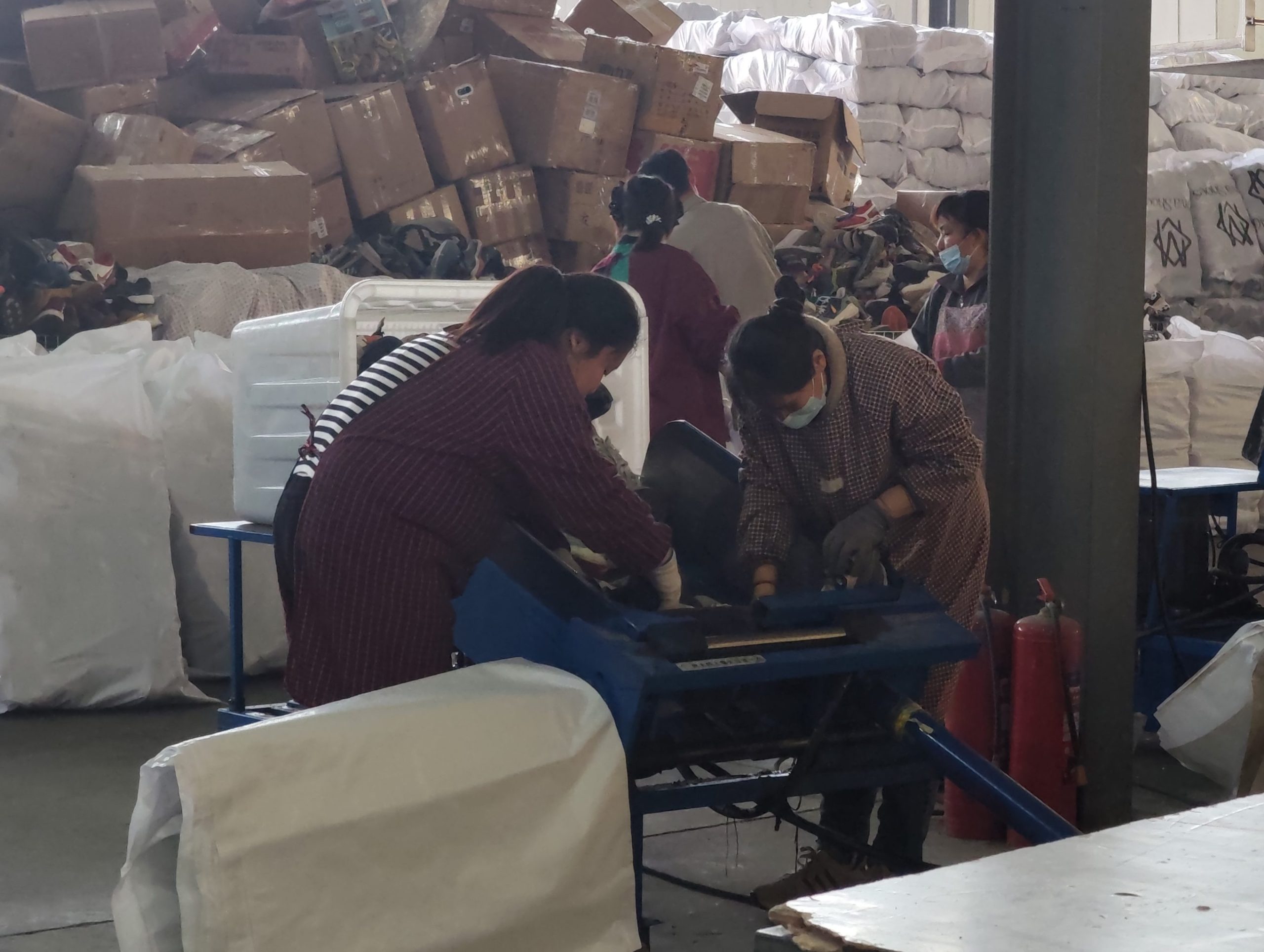 We buy used shoes, clothing, bags and toys from different sources. Not everything that comes in is usable. Some items are too worn. Some are damaged. Our first job is to separate what can be exported from what cannot.