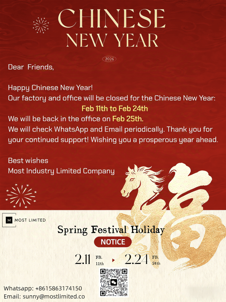 This is to inform you that our office and warehouse will be closed for the Lunar New Year holidays from Sunday, February 11th, 2026, to Saturday, February 24th, 2026.